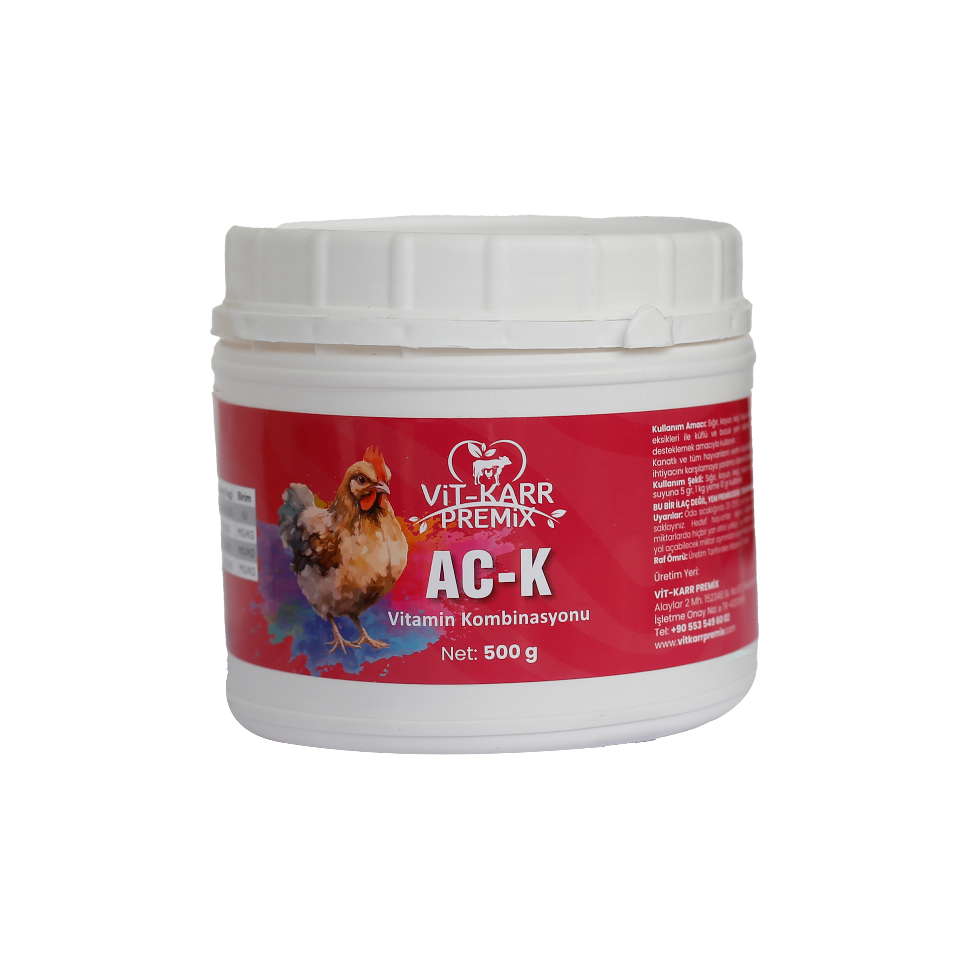 • Büyükbaş, küçükbaş ve kanatlı hayvanların ACK vitamini ihtiyaçlarını karşılamak amacıyla dizayn edilmiş yemde kullanılabilen toz yem premiksdir.• Kanatlı hayvanların, buzağı ve kuzuların koksidiyozis, enterit, toksikozis gibi kanamalı enfeksiyöz ve gaga kesimi gibi non-enfeksiyöz vakalarda gerek epitel dokunun korunması ve iyileşmesine katkıda bulunması gerekse de oluşan kanamanın durdurulması amacıyla kullanılan VİT KARR ACK içerdiği C vitamini ile de bağışıklık sisteminin desteklenmesini ve immun sistemin güçlenmesini sağlar. Gaga kesimi sonucunda oluşan stresi en aza indirmeye yardımcıdır.